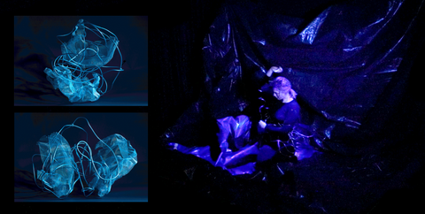 For Held, I transformed a room into an ocean-like scene using draped tarpaulin, video projections of water vibrating, lighting, and then my body and metal wire as materials for live performance. Again, the metal material is moulded by my body as I wrestle and hold it; exploring different meanings of being ‘held’. Here, the metal used as symbolic representation of seaweed, is about the struggle with shame, and accepting a new body and identity after such visceral trauma.