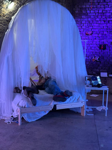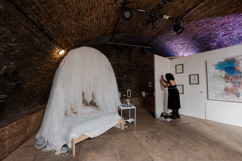 Draped bed installation with night table created with help of volunteers. Live painting performance by Femtxt next to mixed media painting and oil pastel drawings by Tasalla Tabasom.