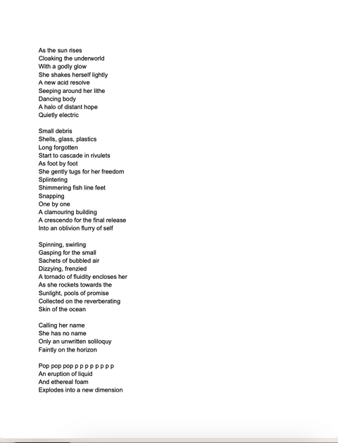 For sound and visuals, I recorded my voice, body, my partner’s body and daily elements around the household including ASMR soundbites. The abstraction of using these elements was my response to working with psychogeography for the first time; I roamed around my dwelling with a curious approach, trialling various visual and audio effects that could represent the underwater journey of a seaweed. These were documented on a Tascam Recorder DR-100 MKIII, a Sony A7III DSLR camera and edited in Adobe Premiere Pro.