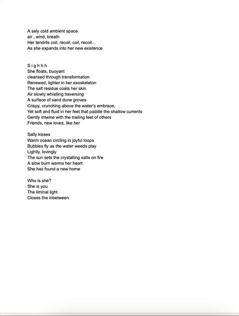 Drawing on my research on intersectional feminist queer theory from an anti-anthropocentric view, I imagine bodies otherwise through seaweed in the ocean. Inspired by Joan Jonas’s self-portraits amongst landscape that promote a deep ecological view, the seaweed becomes a metaphor for those who have felt oppression in relation to gender, sexuality and the body.